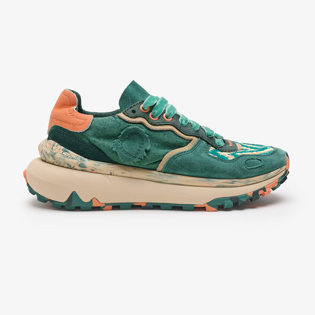 Cordones extra con acabado aterciopelado y ojales a color en contraste con la piel.Nuestra suela Metta Love, voluminosa a la vez que ligera.