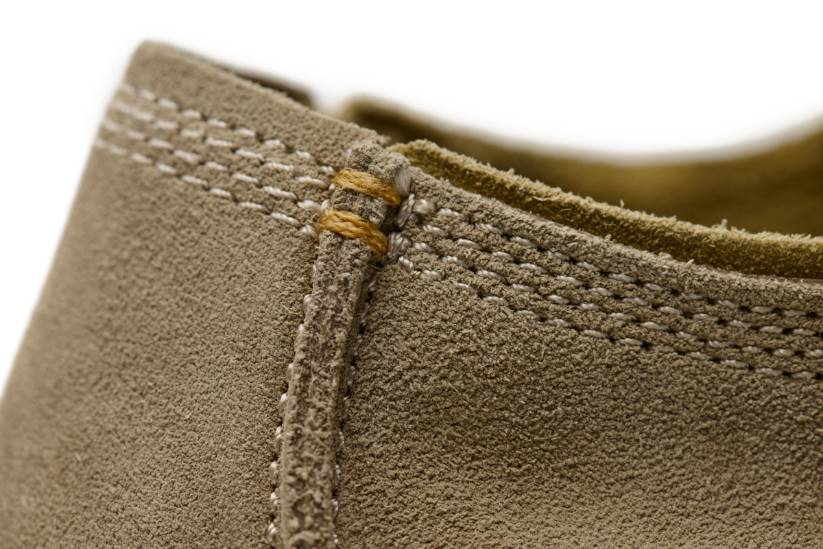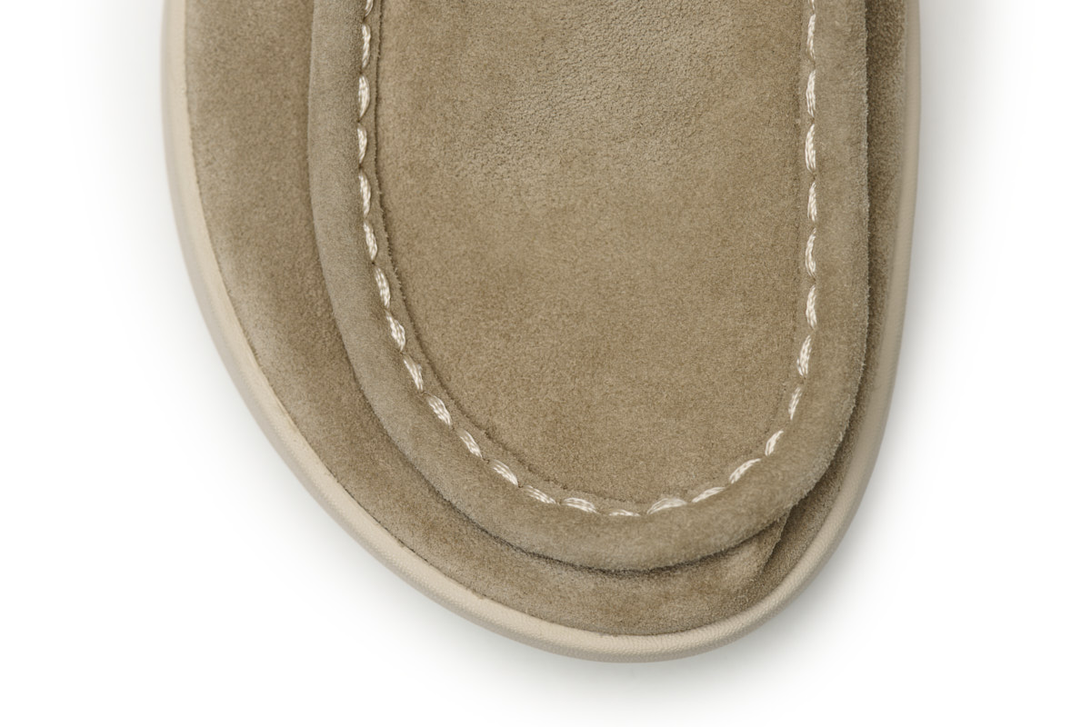 Inspirado en los mocasines "wallaby" de los años 60, esta nueva versión sin forro es aún más suave y cómoda gracias a la sustitución del cuero de plena flor por serraje. Los detalles singulares como los cordones de piel y los cosidos a mano, crean un look realmente rústico y natural.